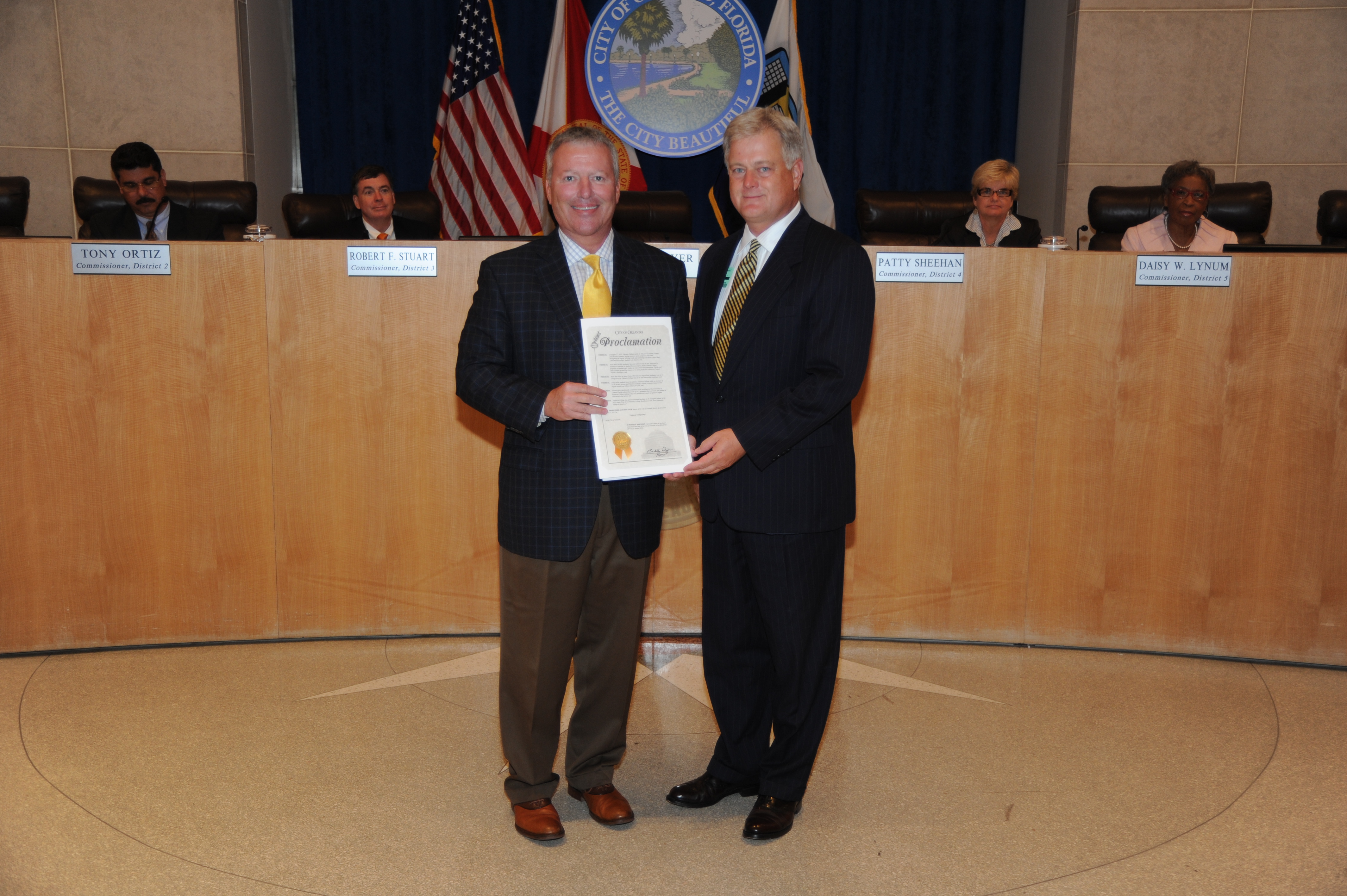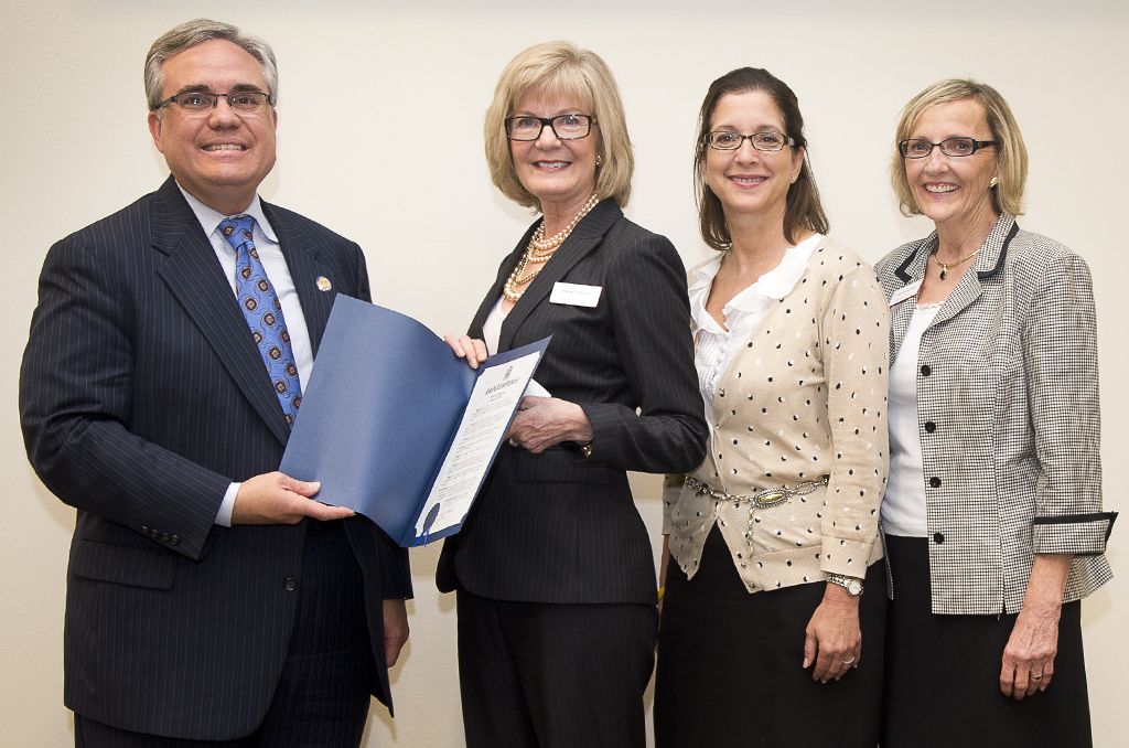 Valencia College’s president, Dr. Sandy Shugart, was on hand at the Orlando City Council meeting on Aug. 20 to accept the proclamation from Orlando Mayor Buddy Dyer. In Winter Park, Dr. Stacey Johnson, president of the Winter Park and East campuses, accepted the proclamation from Winter Park Mayor Ken Bradley. Accompanying Johnson were Lucy Boudet, vice president of marketing and strategic communications for Valencia, and Michele McArdle, executive dean of Valencia’s Winter Park Campus.