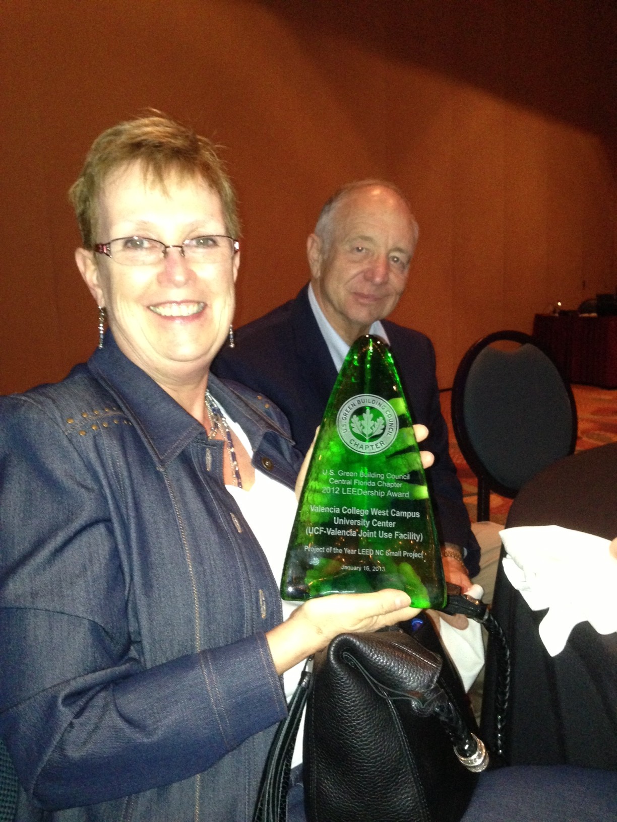 The LEEDership award, Valencia College’s first, was accepted by Lamar Powers, Valencia’s facilities director and project manager for the University Center, and Helene Loiselle, Valencia’s assistant vice president for facilities and sustainability.